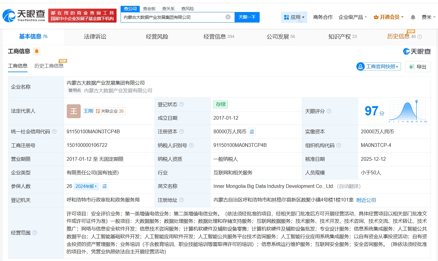 该公司成立于2017年1月,法定代表人为王刚,经营范围包括安全评价业务、第一类增值电信业务、第二类增值电信业务、大数据服务等,由呼和浩特市国有资产监督管理委员会全资持股。