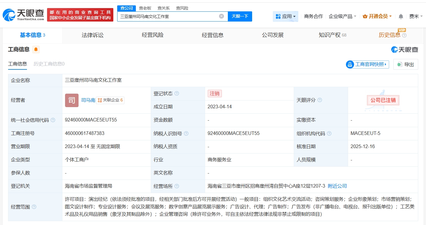 雷达财经讯,天眼查App显示,近日,三亚崖州司马南文化工作室登记状态由存续变更为注销。
