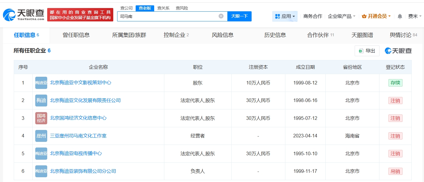该工作室成立于2023年4月,经营者为司马南,经营范围包括演出经纪、组织文化艺术交流活动、咨询策划服务等。值得一提的是,司马南名下关联6家企业,目前仅北京梅迪亚中文影视策划中心处于存续状态。