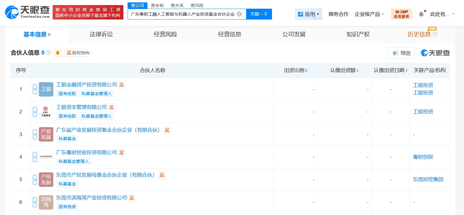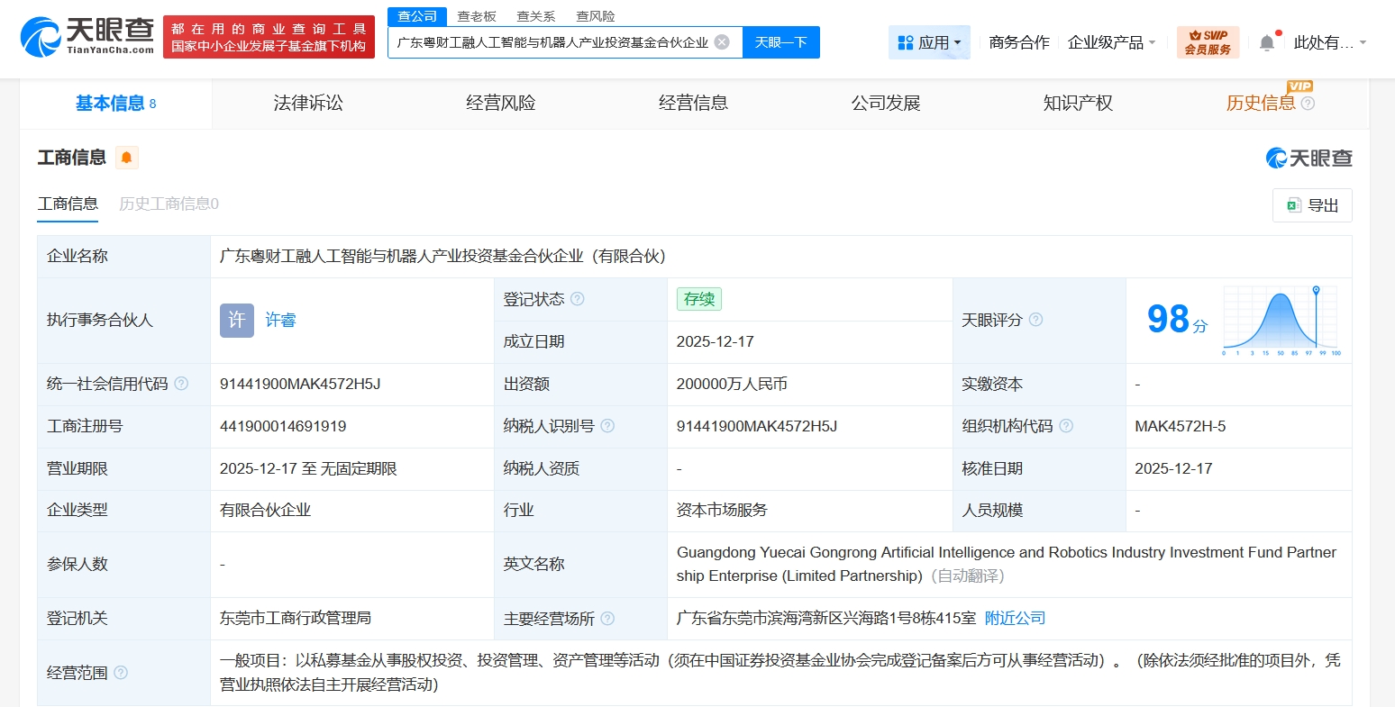 雷达财经讯,天眼查工商信息显示,近日,广东粤财工融人工智能与机器人产业投资基金合伙企业(有限合伙)成立,执行事务合伙人为许睿,出资额20亿人民币,经营范围含以私募基金从事股权投资、投资管理、资产管理等活动。合伙人信息显示,该基金由工银金融资产投资有限公司、工银资本管理有限公司、广东省产业发展投资基金合伙企业(有限合伙)、广东粤财创业投资有限公司等共同出资。