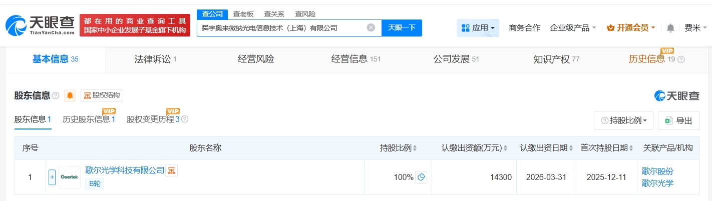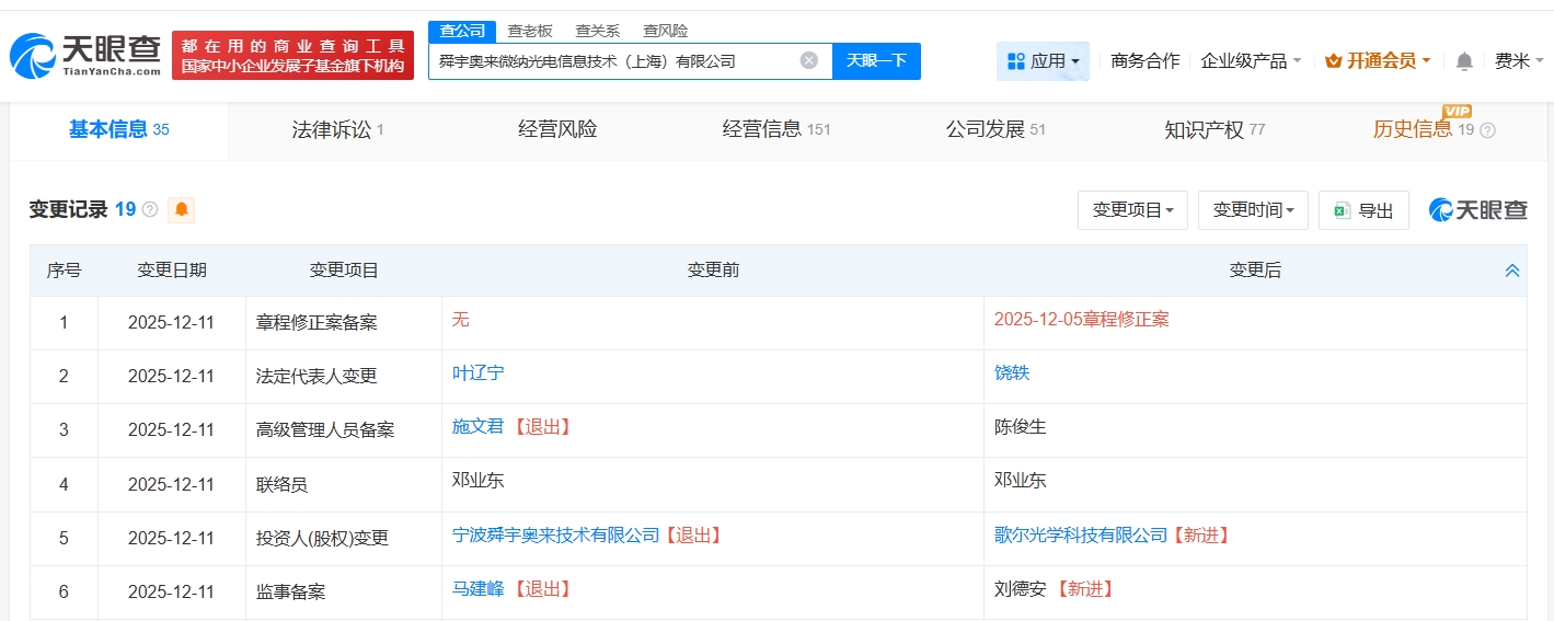 雷达财经讯,天眼查App显示,近日,舜宇奥来微纳光电信息技术(上海)有限公司发生工商变更,原股东舜宇光学旗下宁波舜宇奥来技术有限公司退出,新增歌尔光学科技有限公司为全资股东,同时,叶辽宁卸任该公司法定代表人,由饶轶接任。