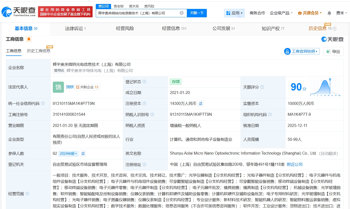 舜宇奥来微纳光电信息技术(上海)有限公司成立于2021年1月,注册资本1.43亿人民币,经营范围包括光学仪器制造、光电子器件制造、电子元器件与机电组件设备制造等。