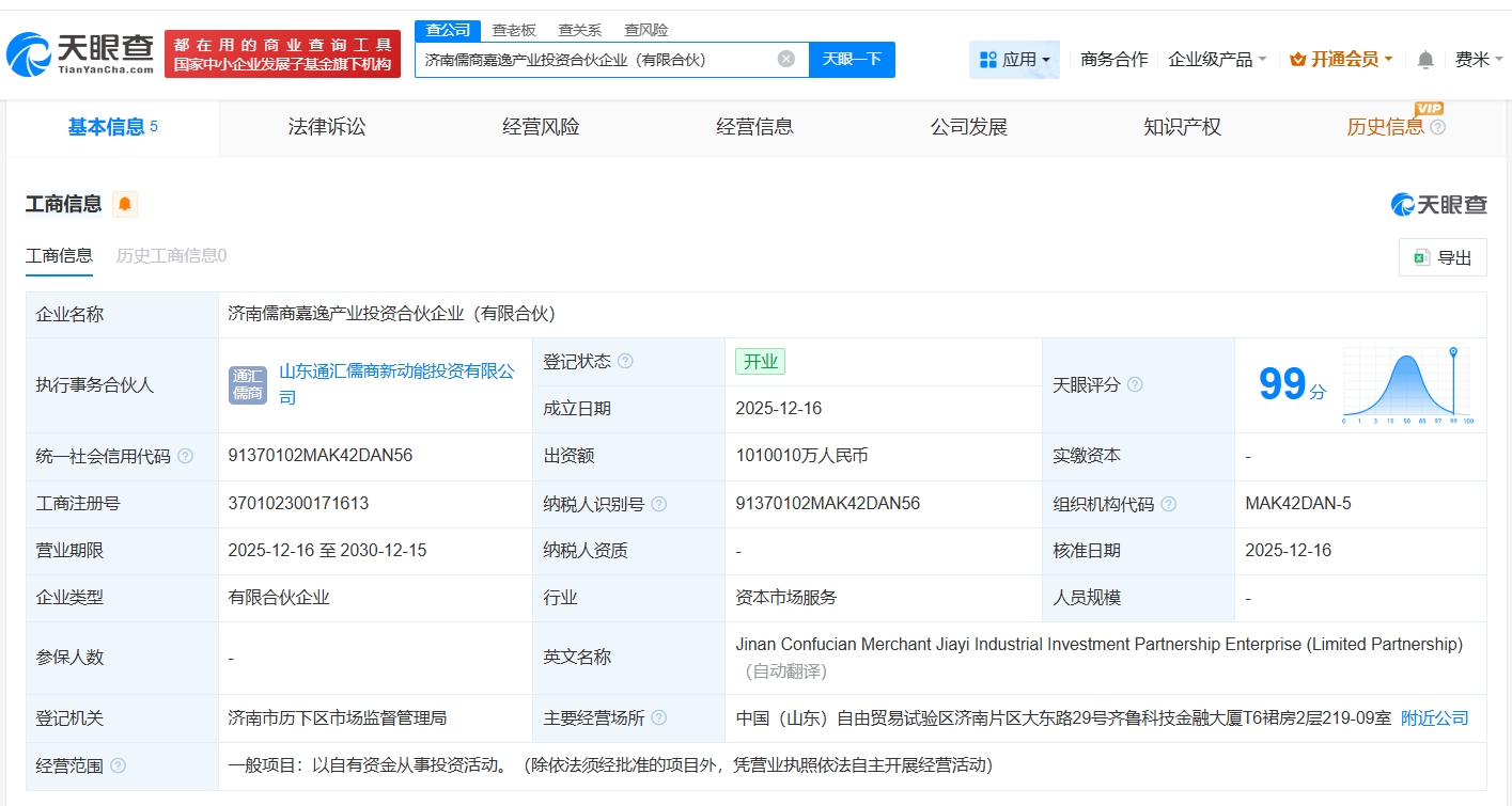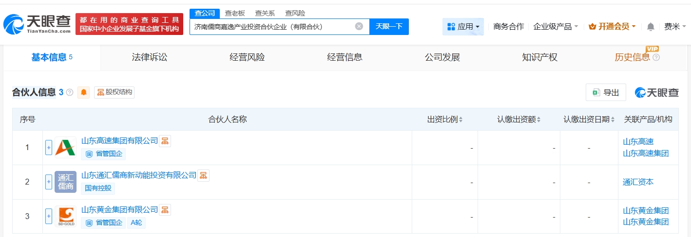 雷达财经讯,天眼查App显示,近日,济南儒商嘉逸产业投资合伙企业(有限合伙)成立,执行事务合伙人为山东通汇儒商新动能投资有限公司,出资额约101亿人民币,经营范围为以自有资金从事投资活动,由山东黄金集团有限公司、山东高速集团有限公司及旗下山东通汇儒商新动能投资有限公司共同出资。