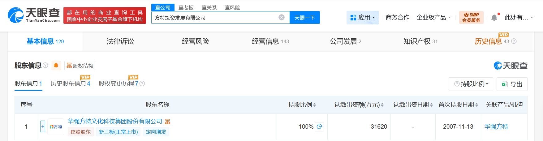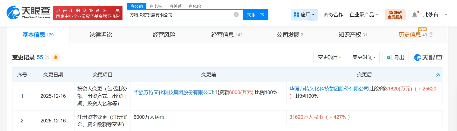 雷达财经讯,天眼查App显示,近日,方特投资发展有限公司发生工商变更,注册资本由6000万人民币增至约3.2亿人民币,增幅427%。