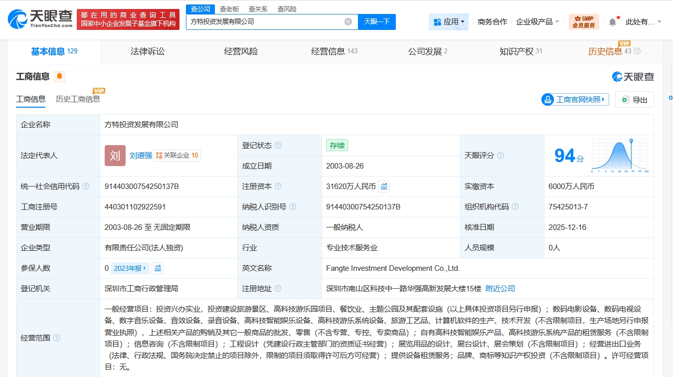 该公司成立于2003年8月,法定代表人为刘道强,经营范围含投资兴办实业,投资建设旅游景区、高科技游乐园项目、餐饮业、主题公园及其配套设施,信息咨询,工程设计等,由华强方特文化科技集团股份有限公司全资持股。