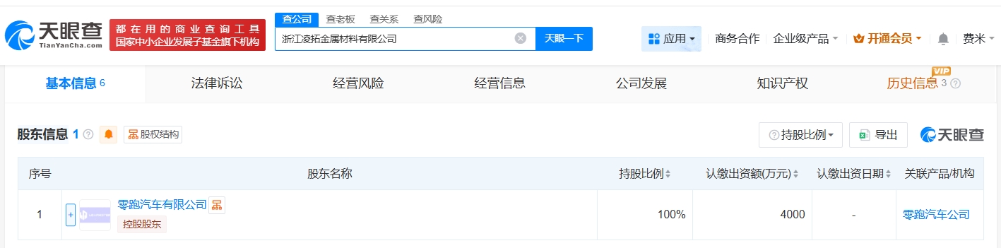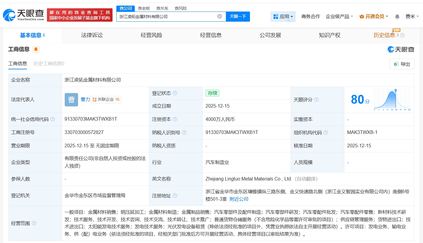 雷达财经讯,天眼查App显示,近日,浙江凌拓金属材料有限公司成立,法定代表人为曹力,注册资本4000万人民币,经营范围包括金属材料销售、钢压延加工、金属材料制造、金属制品销售等,由零跑汽车有限公司全资持股。