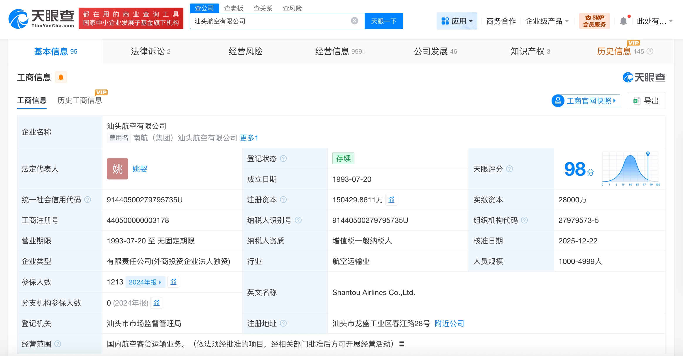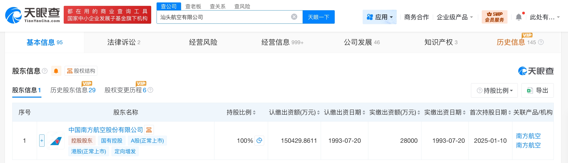 该公司成立于1993年7月,法定代表人为姚㛃,经营范围为国内航空客货运输业务,由南方航空(600029)全资持股。