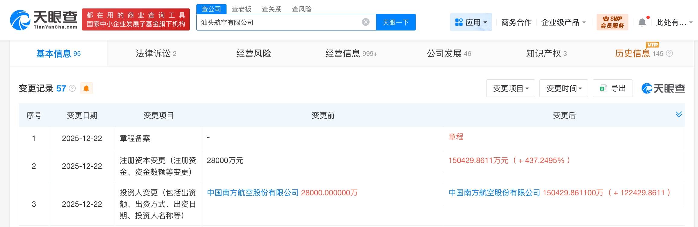 雷达财经讯,天眼查App显示,近日,汕头航空有限公司发生工商变更,注册资本由2.8亿人民币增至约15.04亿人民币,增幅约437%。