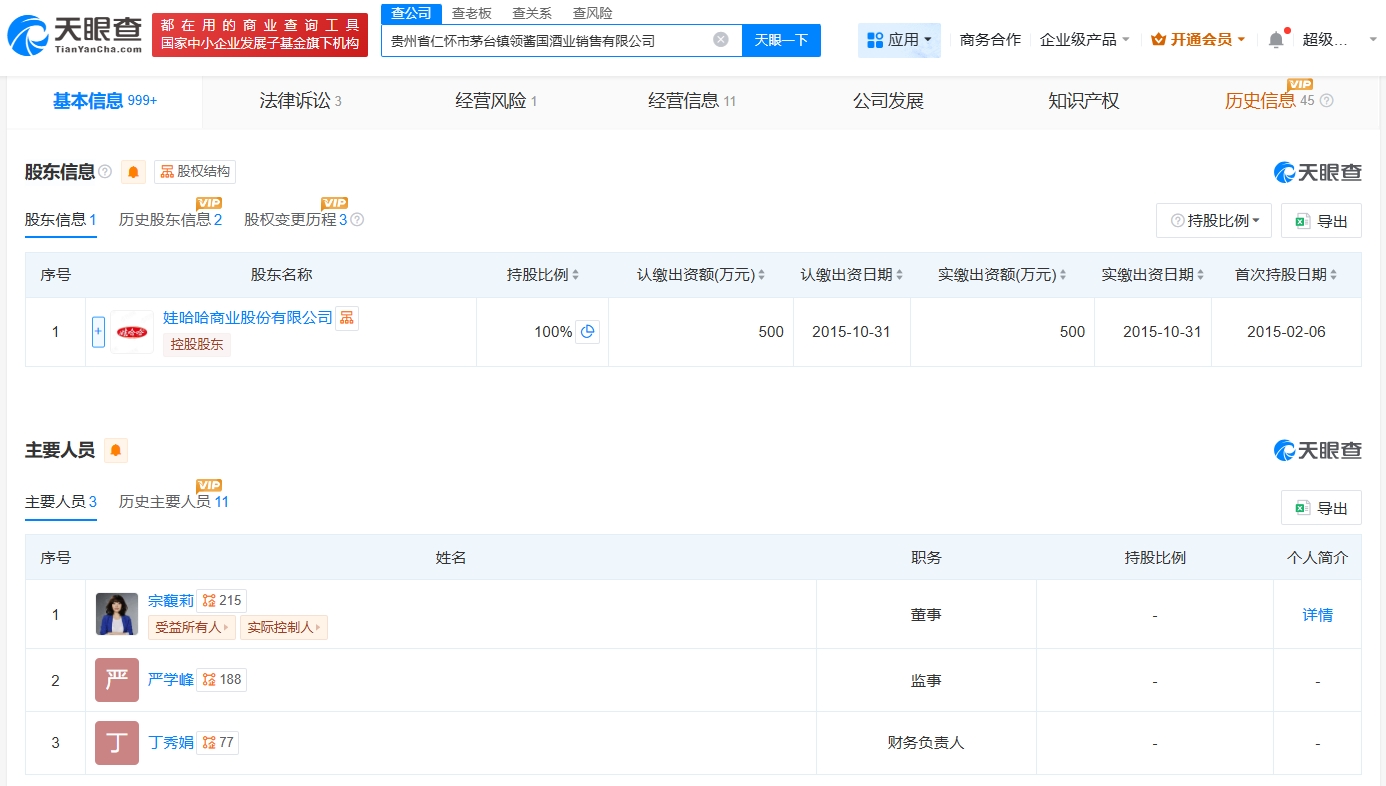该公司成立于2013年10月,法定代表人为祝丽丹,注册资本500万人民币,由娃哈哈商业股份有限公司全资持股。最终受益人信息显示,宗馥莉为该公司实际控制人。