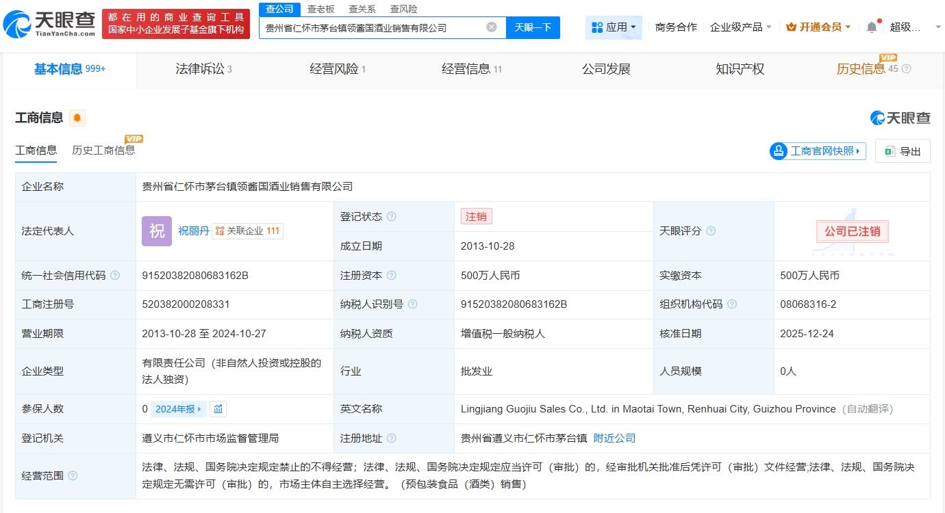 雷达财经讯,天眼查工商信息显示,近日,贵州省仁怀市茅台镇领酱国酒业销售有限公司登记状态由存续变更为注销。