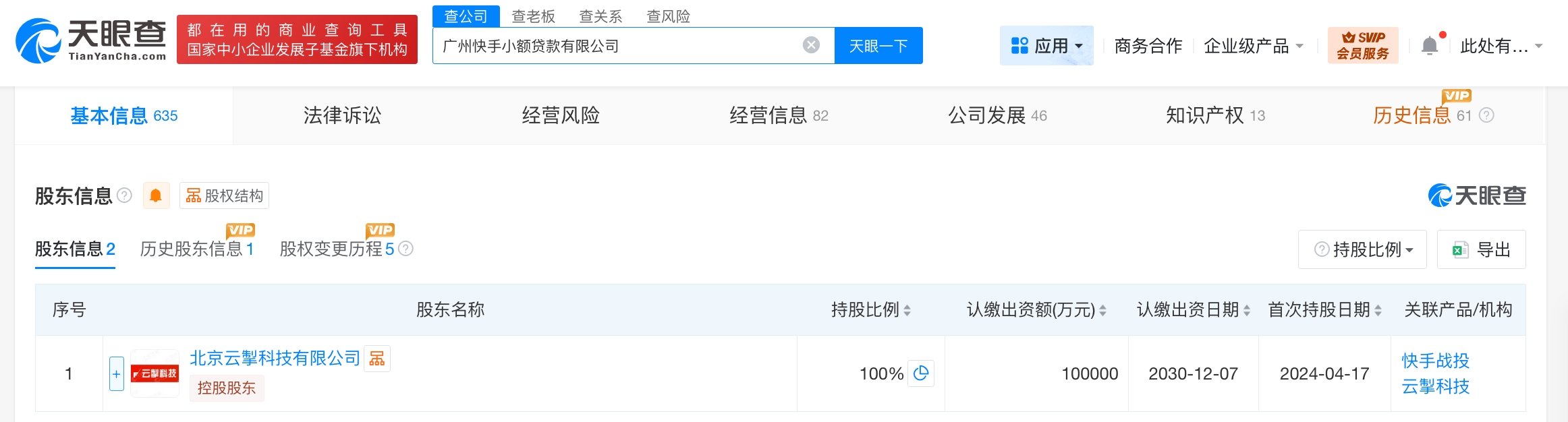 该公司成立于2016年1月,法定代表人为董宇,经营范围为小额贷款业务。股东信息显示,该公司由快手旗下北京云掣科技有限公司全资持股。