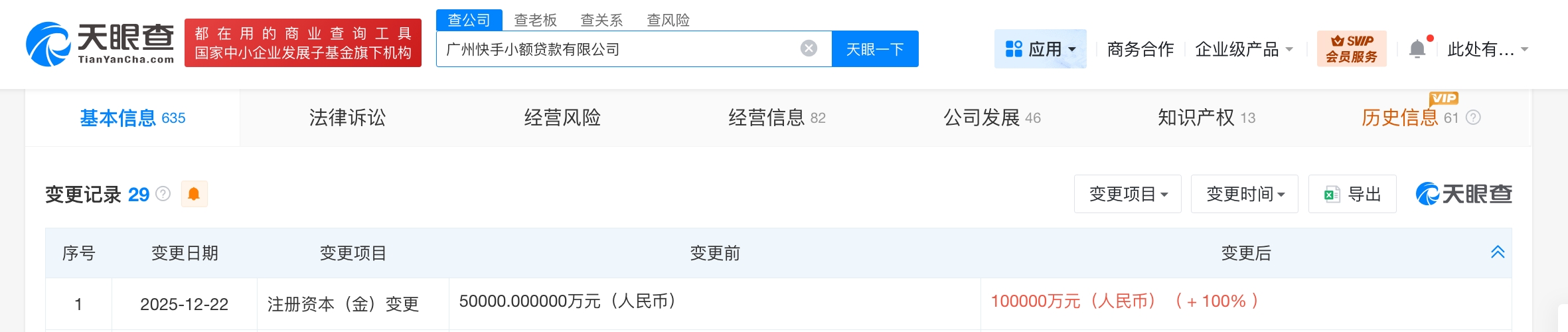 雷达财经讯,天眼查App显示,近日,广州快手小额贷款有限公司发生工商变更,注册资本由5亿人民币增至10亿人民币,增幅100%。