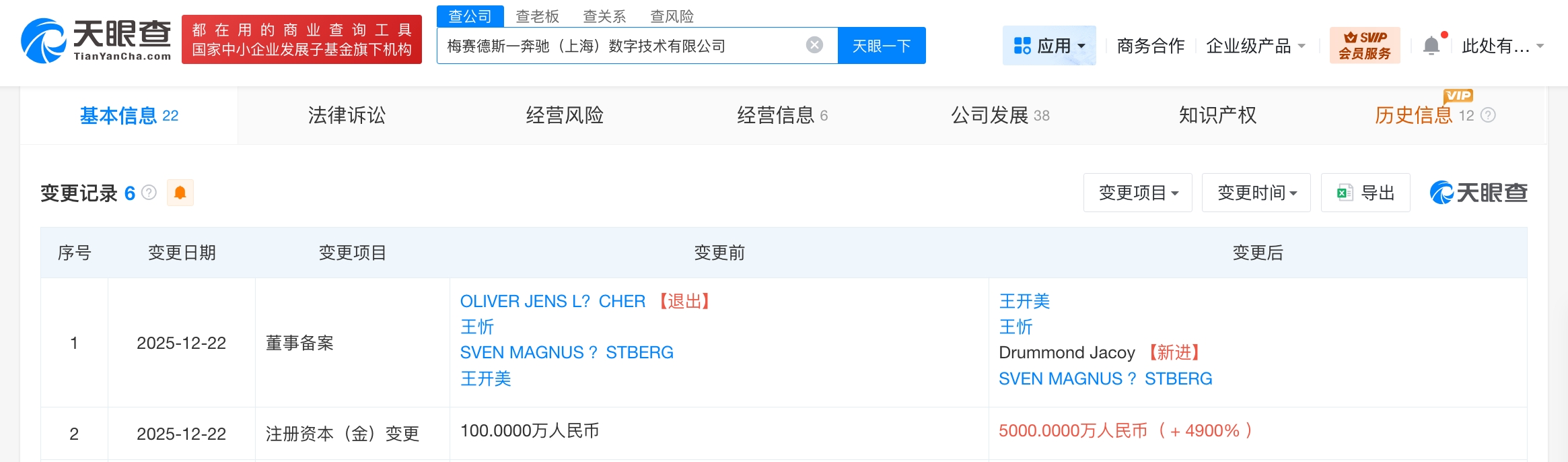 雷达财经讯,天眼查工商信息显示,近日,梅赛德斯一奔驰(上海)数字技术有限公司发生工商变更,注册资本由100万人民币增至5000万人民币,增幅4900%,同时,部分高管也发生变更。