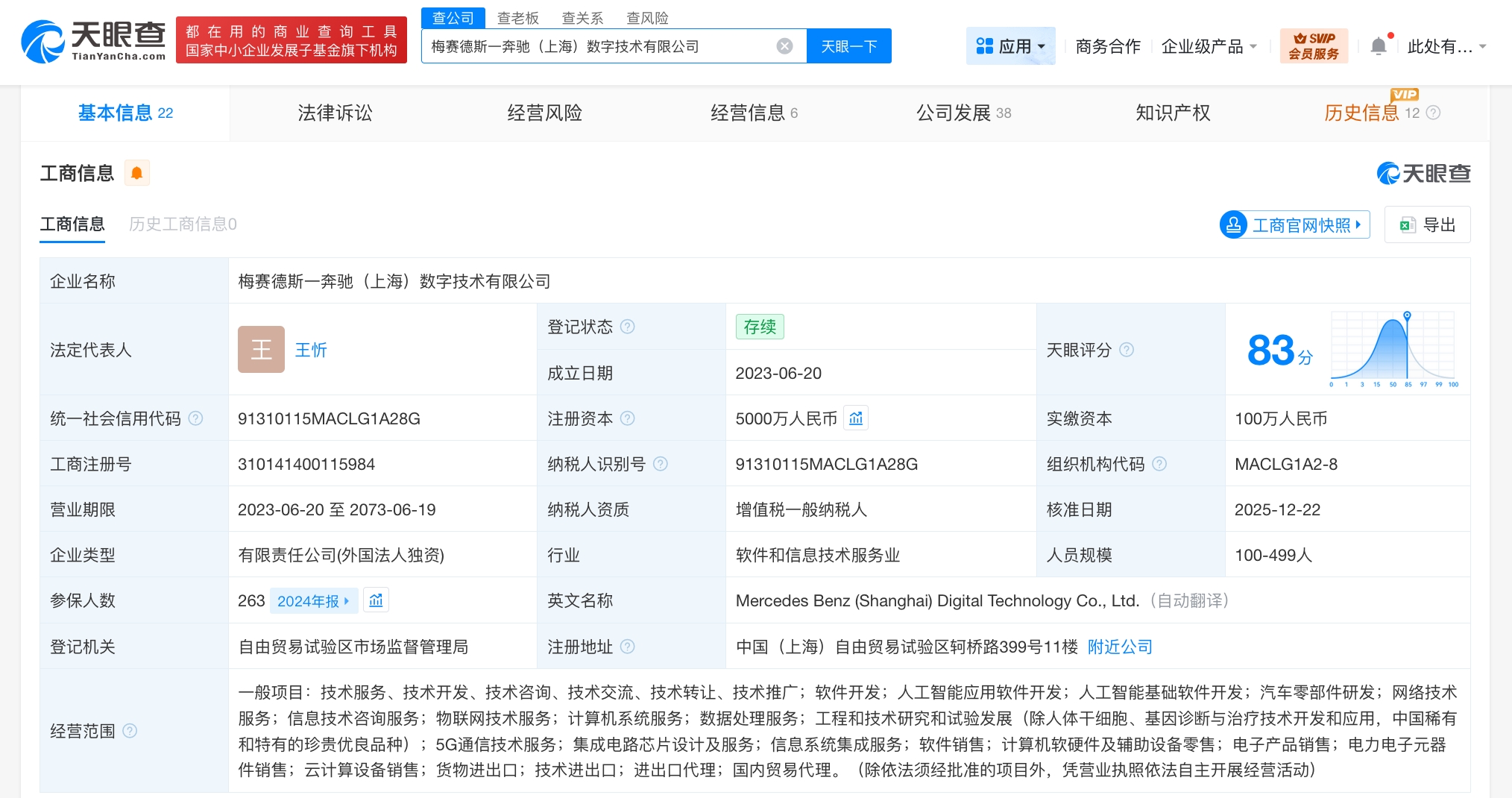 该公司成立于2023年6月,法定代表人为王忻,经营范围含软件开发、人工智能应用软件开发、人工智能基础软件开发、汽车零部件研发、网络技术服务、信息技术咨询服务、物联网技术服务、数据处理服务等。股东信息显示,该公司由梅赛德斯一奔驰(中国)投资有限公司全资持股。