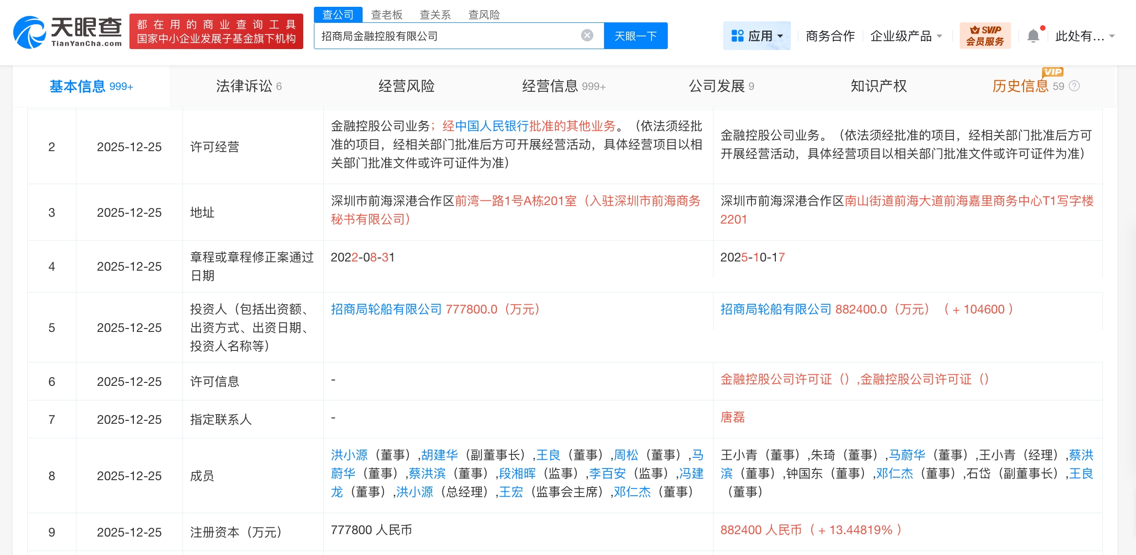 雷达财经讯,天眼查工商信息显示,近日,招商局金融控股有限公司发生工商变更,注册资本由77.78亿人民币增至88.24亿人民币,增幅约13%。