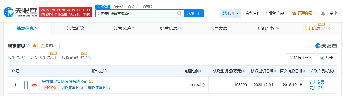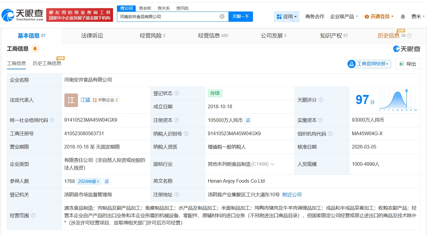 河南安井食品有限公司成立于2018年10月,法定代表人为江猛,经营范围包括速冻食品制造、肉制品及副产品加工、水产品及制品加工等。股东信息显示,该公司由安井食品(603345)全资持股。