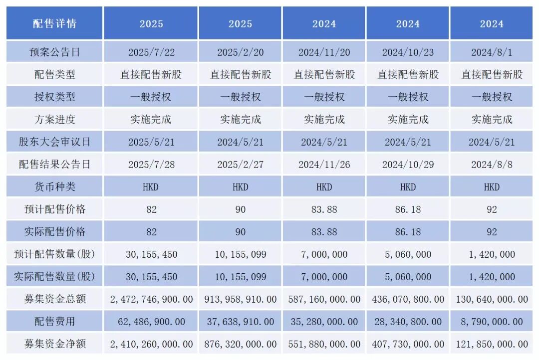 上市不足两年,公司分别于2024年8月、2024年10月、2024年11月、2025年2月、2025年7月完成五次配售募资,累计募资超45亿港元。最近一次配售,优必选发行了30155450股,募资总额约24.7亿港元。