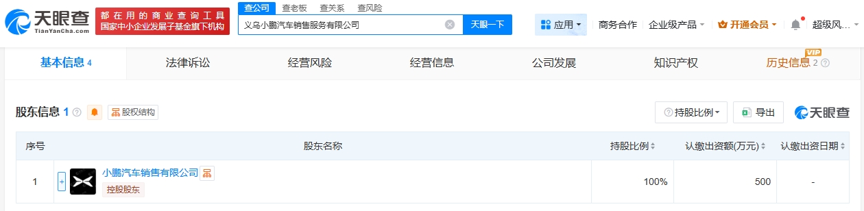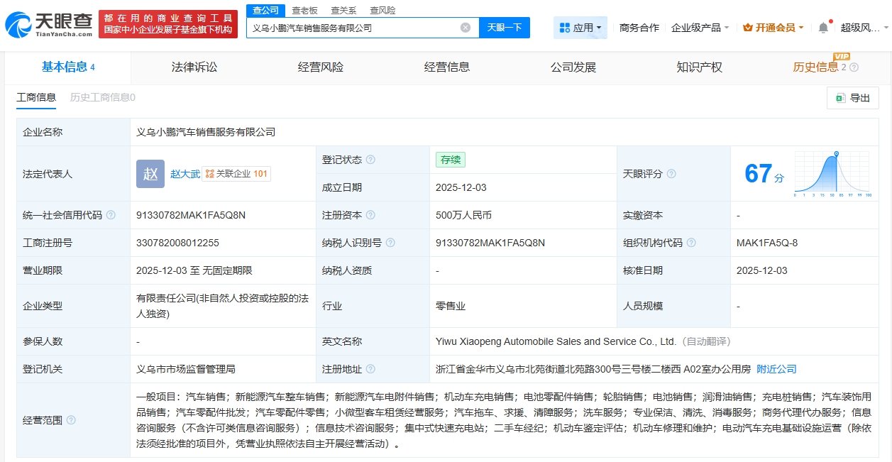 雷达财经讯,天眼查App显示,近日,义乌小鹏汽车销售服务有限公司成立,法定代表人为赵大武,注册资本500万人民币,经营范围包括汽车销售、新能源汽车整车销售、新能源汽车电附件销售、机动车充电销售等。股东信息显示,该公司由小鹏汽车销售有限公司全资持股。