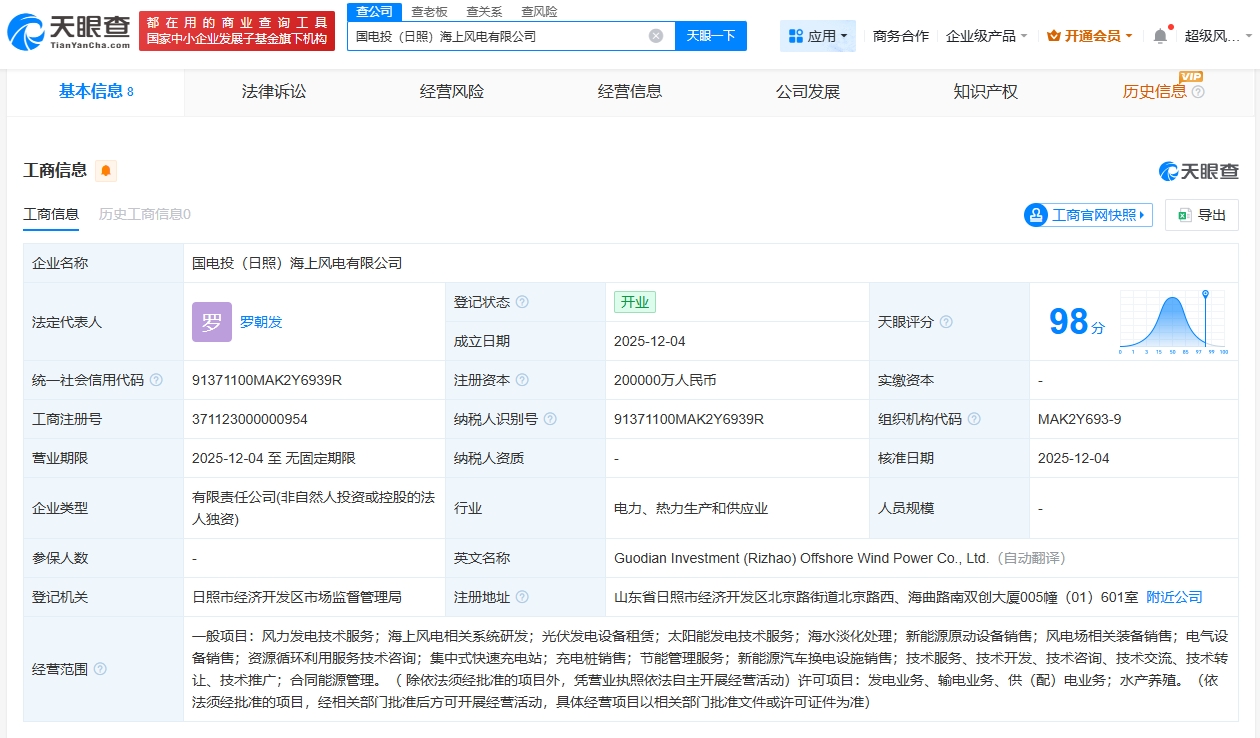 雷达财经讯,天眼查App显示,近日,国电投(日照)海上风电有限公司成立,法定代表人为罗朝发,注册资本20亿人民币,经营范围包括风力发电技术服务、海上风电相关系统研发、光伏发电设备租赁、太阳能发电技术服务、新能源汽车换电设施销售等。股权全景穿透图显示,该公司由中国电力(02380.HK)旗下国家电投集团山东能源发展有限公司全资持股。