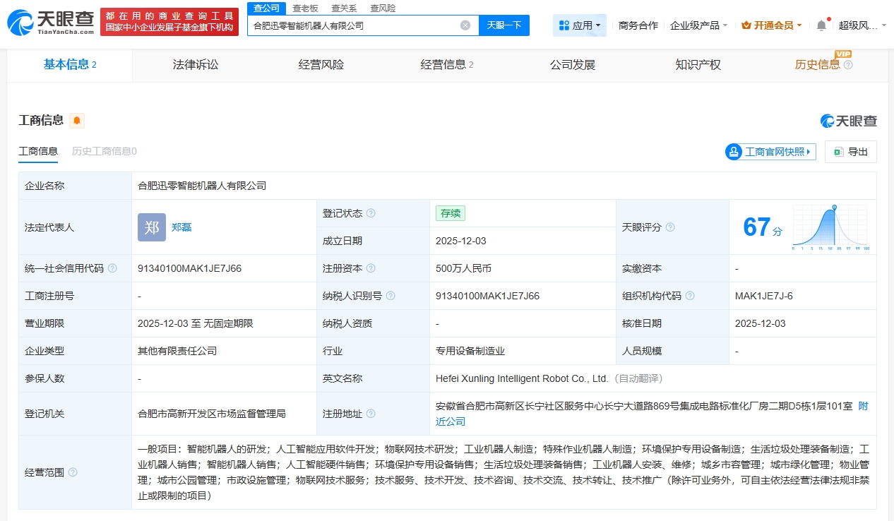雷达财经讯,天眼查App显示,近日,合肥迅零智能机器人有限公司成立,法定代表人为郑磊,注册资本500万人民币,经营范围包括智能机器人的研发、人工智能应用软件开发、物联网技术研发、工业机器人制造等。股权全景穿透图显示,该公司由劲旅环境(001230)旗下上海迅零智能科技有限公司全资持股。