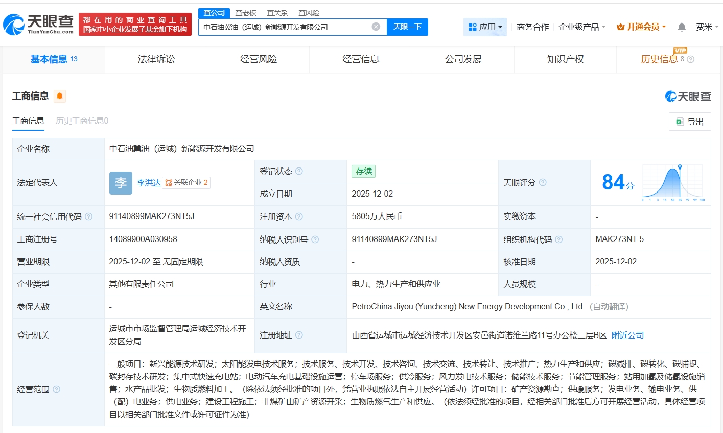 雷达财经讯,天眼查App显示,近日,中石油冀油(运城)新能源开发有限公司成立,法定代表人为李洪达,注册资本5805万人民币,经营范围包括新兴能源技术研发、太阳能发电技术服务、热力生产和供应等,由中石油太湖(北京)投资有限公司、运城市热力有限公司共同持股。