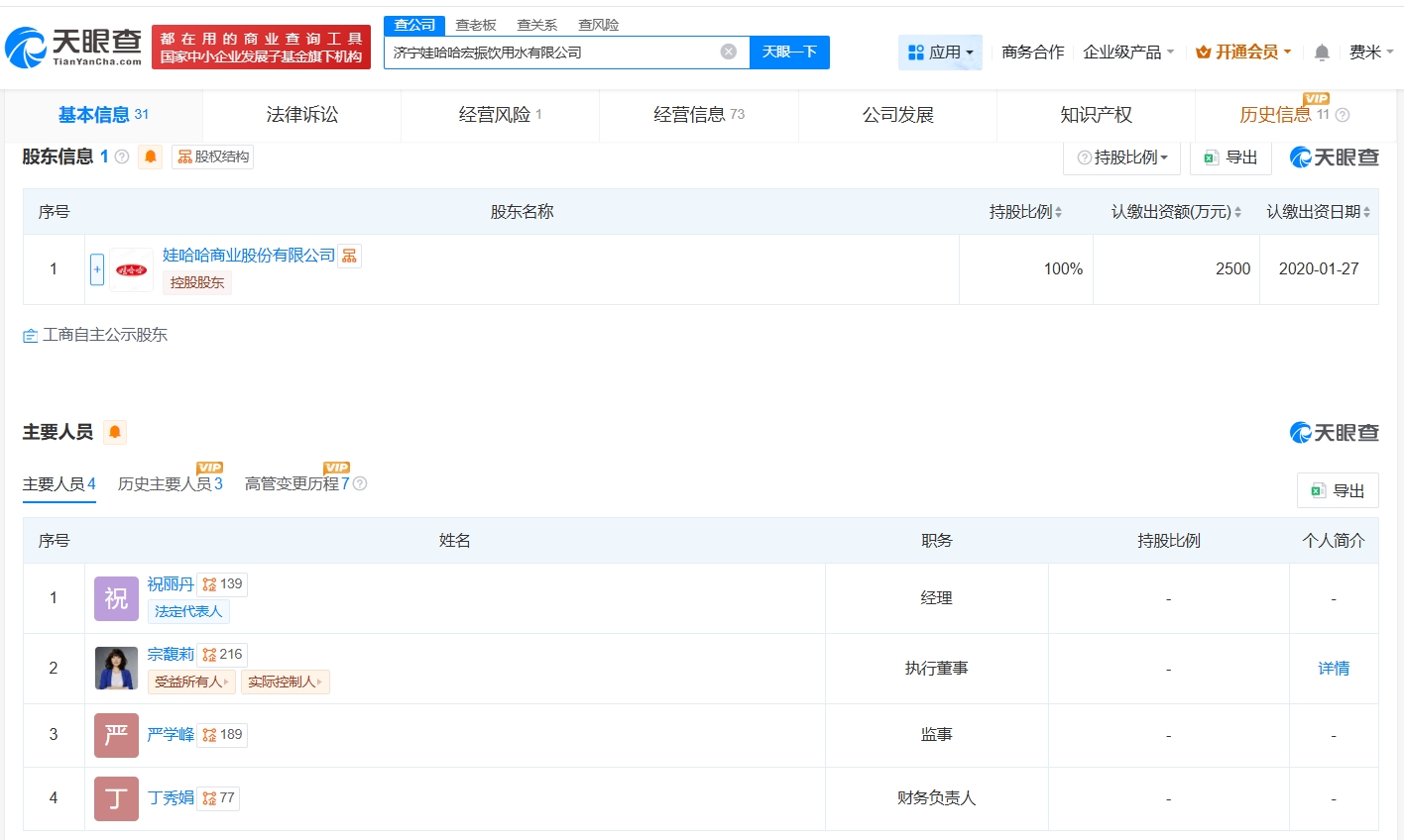 该公司成立于2015年1月,法定代表人为祝丽丹,执行董事为宗馥莉,注册资本2500万人民币,经营范围为饮料、塑料包装制品生产、销售,由娃哈哈商业股份有限公司全资持股。