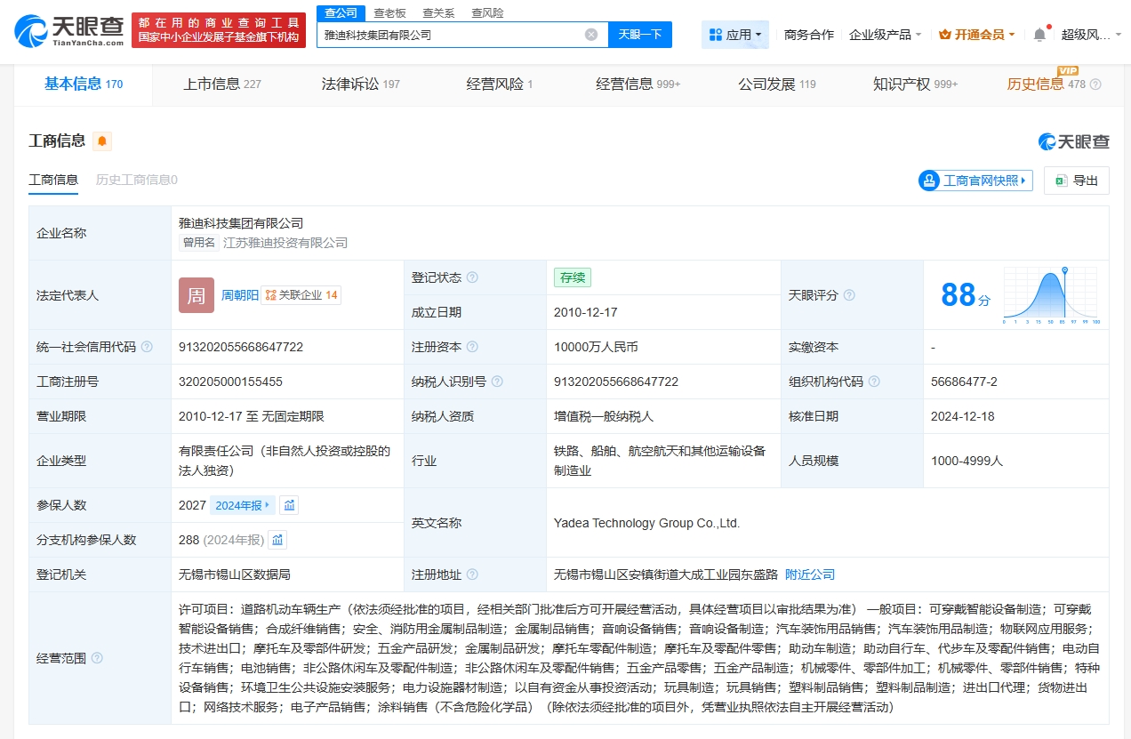 天眼查App显示,雅迪科技集团有限公司成立于2010年12月,法定代表人为周朝阳,注册资本1亿人民币,经营范围包括道路机动车辆生产、摩托车及零部件研发、助动车制造等,由无锡雅迪咨询有限公司全资持股。对外投资信息显示,该公司持有40余家股份,包括江苏雅迪科技发展有限公司、安徽雅迪新能源机车制造有限公司等。天眼风险信息显示,该公司涉及多起法律诉讼,案由包括产品责任纠纷等。此外,今年8月,该公司因制售不符合质量标准的商品,被无锡市锡山区市场监督管理局罚款2.78万余元,没收违法所得4100元。