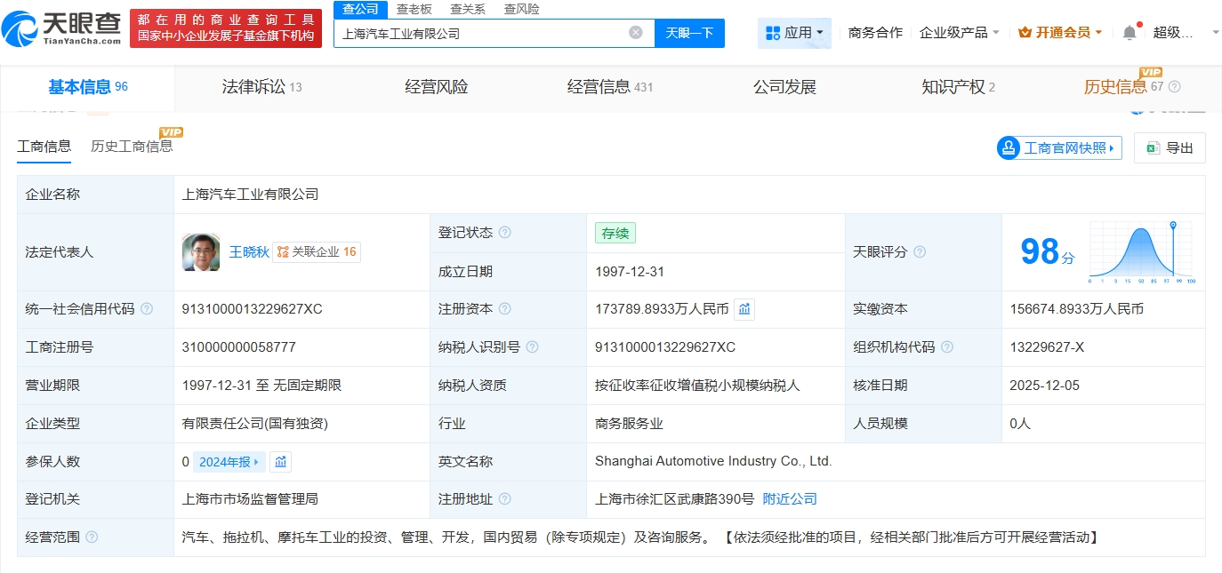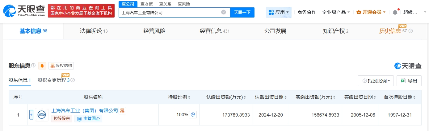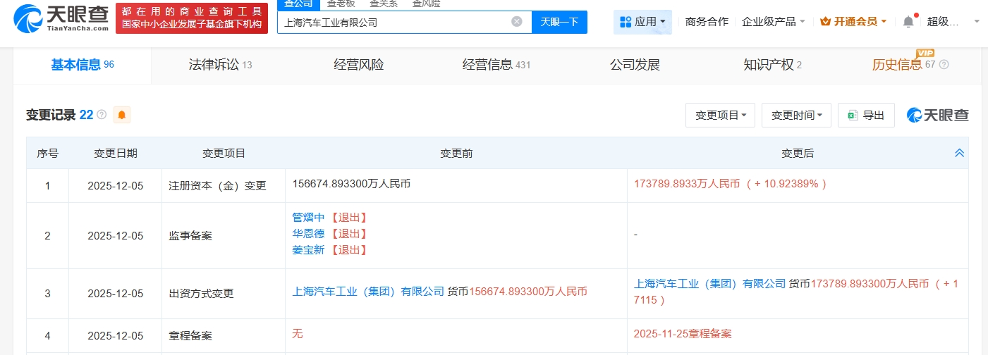 雷达财经讯,天眼查App显示,近日,上海汽车工业有限公司发生工商变更,注册资本由约15.67亿人民币增至约17.38亿人民币,增幅约10.9%。