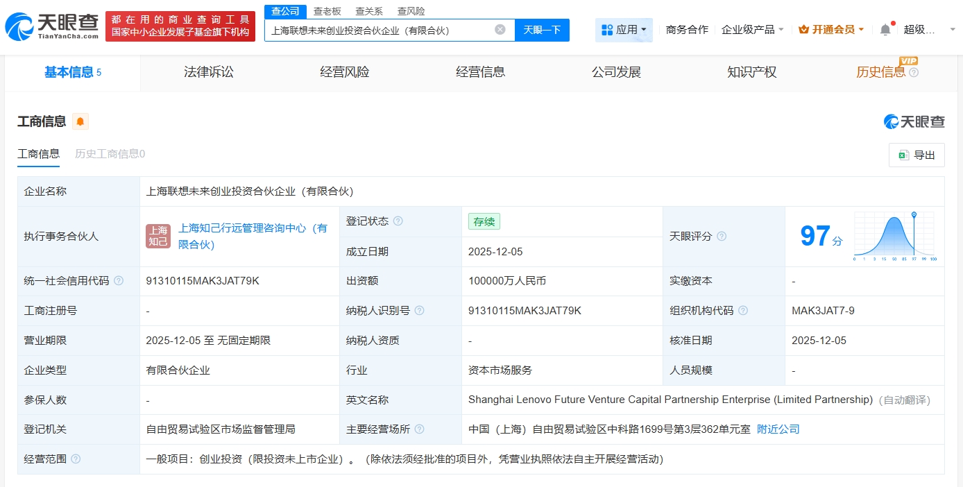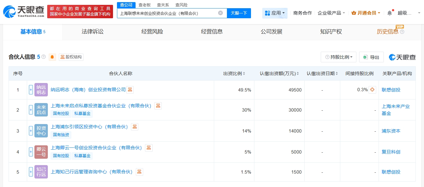 雷达财经讯,天眼查工商信息显示,近日,上海联想未来创业投资合伙企业(有限合伙)成立,执行事务合伙人为上海知己行远管理咨询中心(有限合伙),出资额10亿人民币,经营范围为创业投资。合伙人信息显示,该合伙企业由联想旗下纳远明志(海南)创业投资有限公司、上海未来启点私募投资基金合伙企业(有限合伙)、上海浦东引领区投资中心(有限合伙)等共同出资。