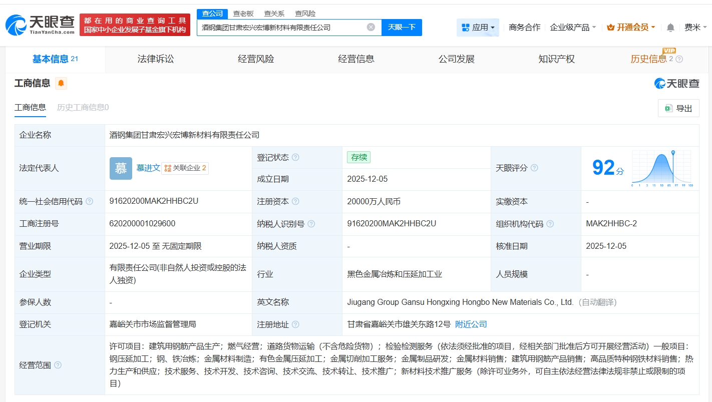 雷达财经讯,天眼查App显示,近日,酒钢集团甘肃宏兴宏博新材料有限责任公司成立,法定代表人为慕进文,注册资本2亿人民币,经营范围包括建筑用钢筋产品生产、燃气经营、道路货物运输等,由酒钢宏兴(600307)全资持股。