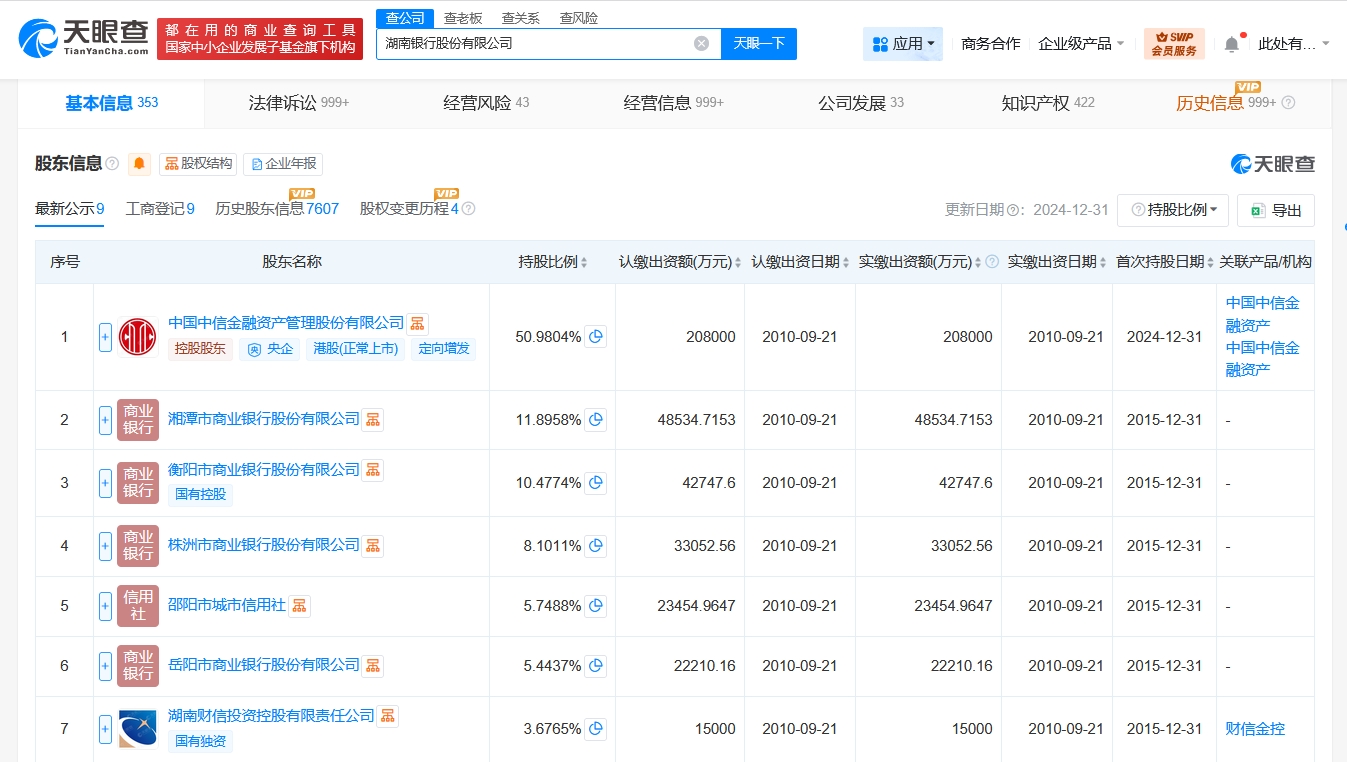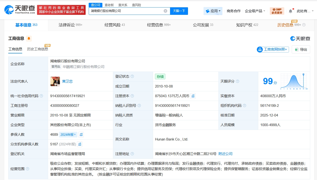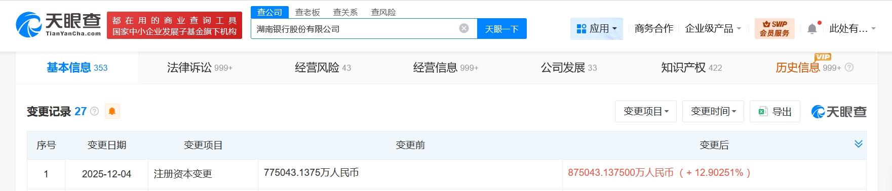 雷达财经讯,天眼查工商信息显示,近日,湖南银行股份有限公司发生工商变更,注册资本由约77.5亿人民币增至约87.5亿人民币,增幅约13%。
