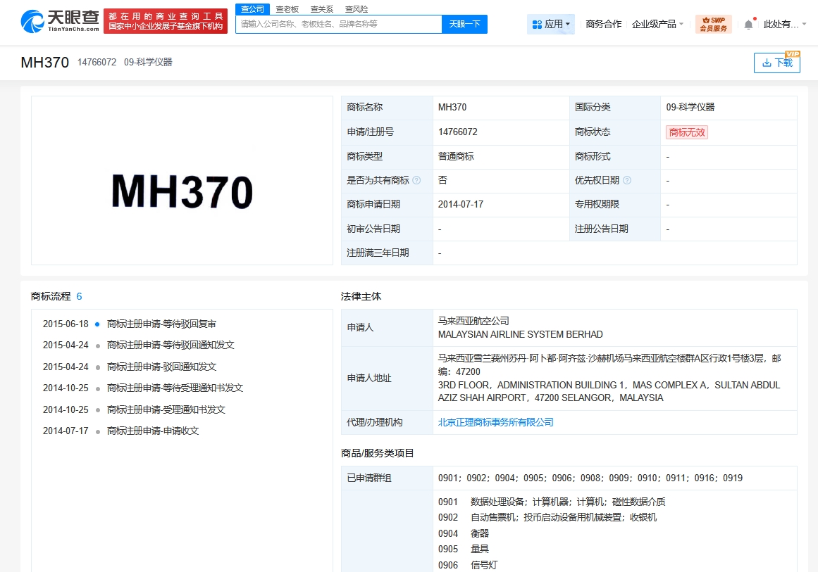 天眼查知识产权信息显示,“MH370”“失联MH370”曾被申请注册为商标,国际分类包括手工器械、日化用品、运输工具等,申请人为杭州某投资公司、广州某贸易公司等。值得注意的是,马来西亚航空公司曾于2014年7月申请注册一枚“MH370”商标,国际分类为科学仪器。目前,上述商标均已被驳回,处于无效状态。