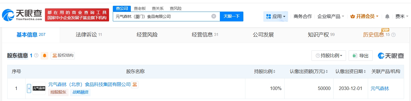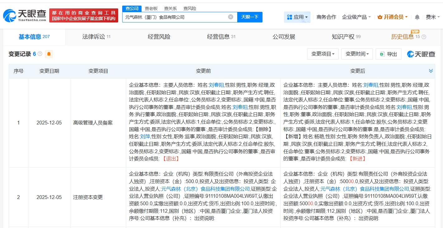 雷达财经讯,天眼查App显示,近日,元气森林(厦门)食品有限公司发生工商变更,注册资本由500万人民币增至5亿人民币,增幅9900%。