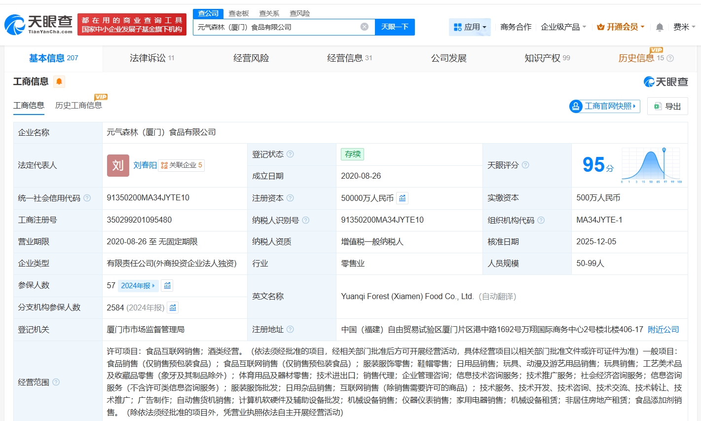 该公司成立于2020年8月,法定代表人为刘春阳,经营范围包括食品互联网销售、酒类经营、食品销售、服装服饰零售等,由元气森林(北京)食品科技集团有限公司全资持股。