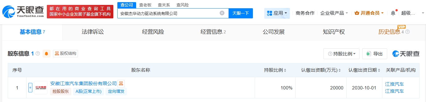 雷达财经讯,天眼查App显示,近日,安徽杰华动力驱动系统有限公司成立,法定代表人为罗世成,注册资本2亿人民币,经营范围包括汽车零部件及配件制造、供应链管理服务、汽车零部件研发等。股东信息显示,该公司由江淮汽车(600418)全资持股。