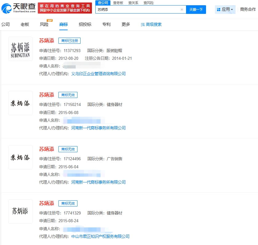天眼查知识产权信息显示,“苏炳添”曾被多方申请注册为商标,国际分类涉及服装鞋帽、健身器材、广告销售,当前商标状态多为无效,已注册的服装鞋帽类“苏炳添”也被无效宣告。