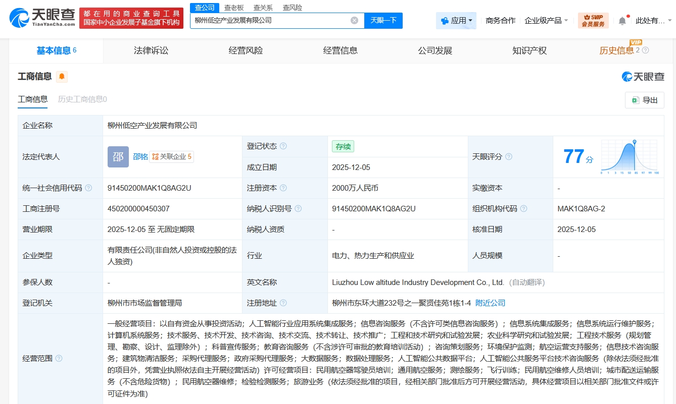 雷达财经讯,天眼查App显示,近日,柳州低空产业发展有限公司成立,法定代表人为邵铭,注册资本2000万人民币,经营范围含以自有资金从事投资活动、人工智能行业应用系统集成服务、信息咨询服务、信息系统集成服务、信息系统运行维护服务、计算机系统服务、工程和技术研究和试验发展、农业科学研究和试验发展、工程技术服务等。股东信息显示,该公司由广西柳州市轨道交通投资发展集团有限公司全资持股。