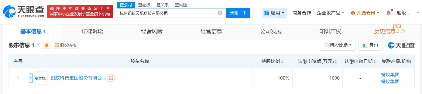 雷达财经讯,天眼查App显示,近日,杭州蚂蚁云帆科技有限公司成立,法定代表人为徐晟薇,注册资本1000万人民币,经营范围包括企业管理咨询、网络技术服务、计算机软硬件及辅助设备批发、互联网销售等。股东信息显示,该公司由蚂蚁科技集团股份有限公司全资持股。
