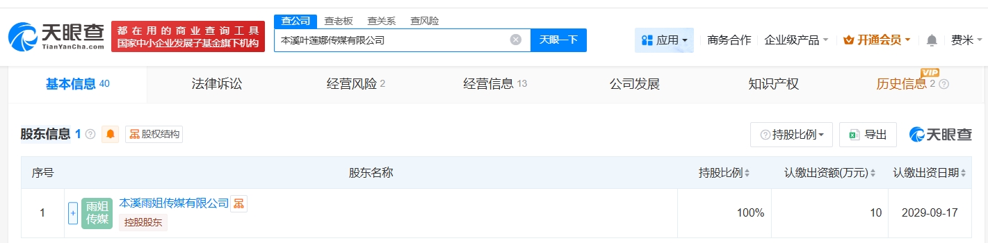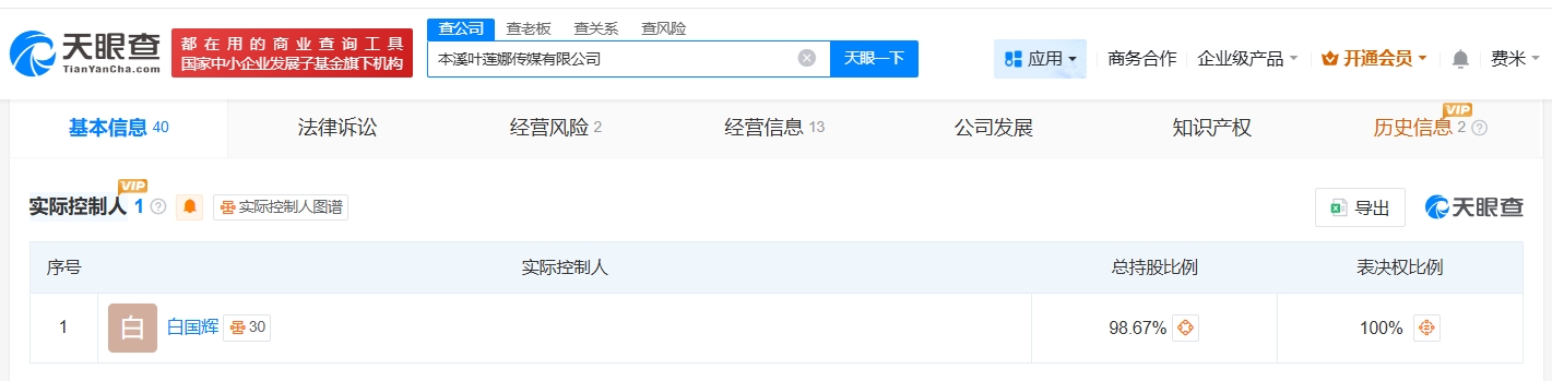 本溪叶莲娜传媒有限公司成立于2024年9月,法定代表人为叶莲娜·叶夫格尼耶夫娜·巴热诺娃,注册资本10万人民币,经营范围包括互联网直播技术服务、食品销售、网络设备销售等,由本溪雨姐传媒有限公司全资持股。最终受益人信息显示,该公司实际控制人为东北雨姐丈夫白国辉。