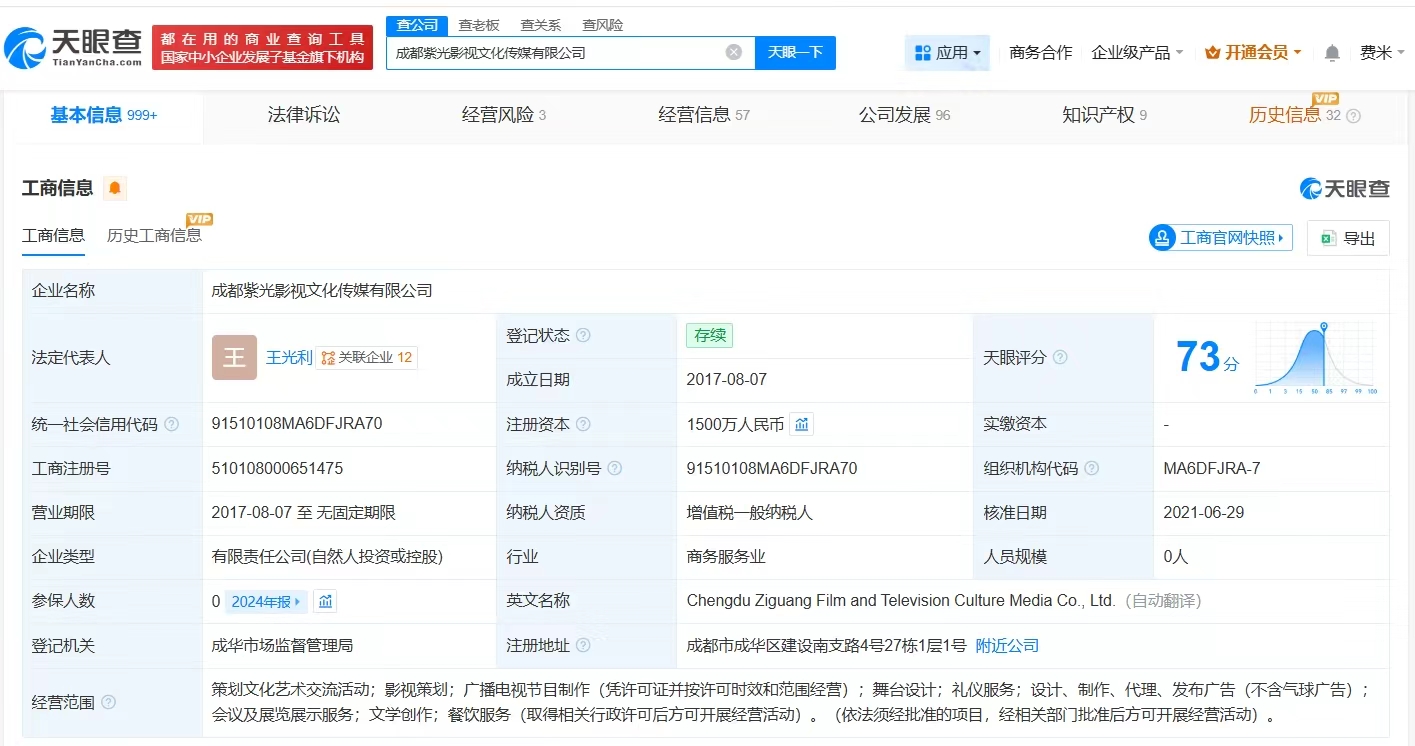 雷达财经讯,天眼查App显示,近日,成都紫光影视文化传媒有限公司登记状态由存续变更为注销,此前,该公司已发布注销备案公告。