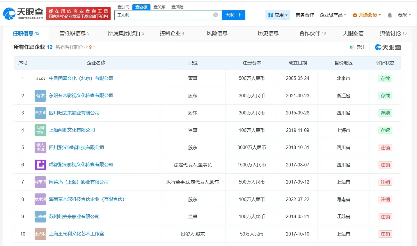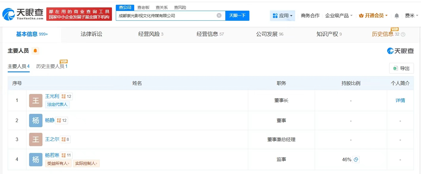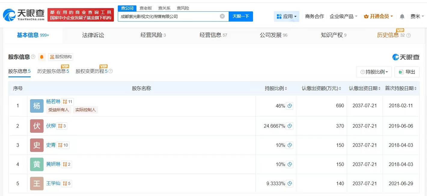 该公司成立于2017年8月,法定代表人、董事长为秦雯老公王光利,注册资本1500万人民币,经营范围包括策划文化艺术交流活动、影视策划、广播电视节目制作、舞台设计等,由杨若琳、伏柳、史青等共同持股。值得一提的是,今年9月和10月,王光利名下海南草木深科技合伙企业(有限合伙)、四川紫光创域科技有限公司已注销。