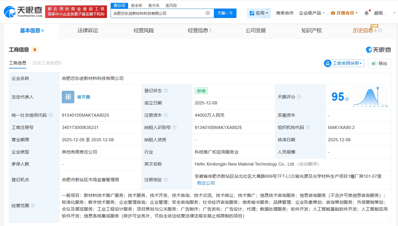 雷达财经讯,天眼查App显示,近日,合肥芯东进新材料科技有限公司成立,法定代表人为崔芳鑫,注册资本4.4亿人民币,经营范围包括新材料技术推广服务、数字技术服务、企业管理咨询、企业管理等。股东信息显示,该公司由北京芯进科技有限公司、青岛初芯瑞伯创业投资基金合伙企业(有限合伙)、翰博高新材料(合肥)股份有限公司共同持股。