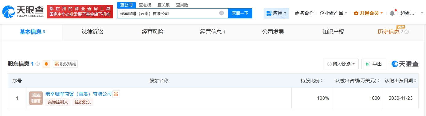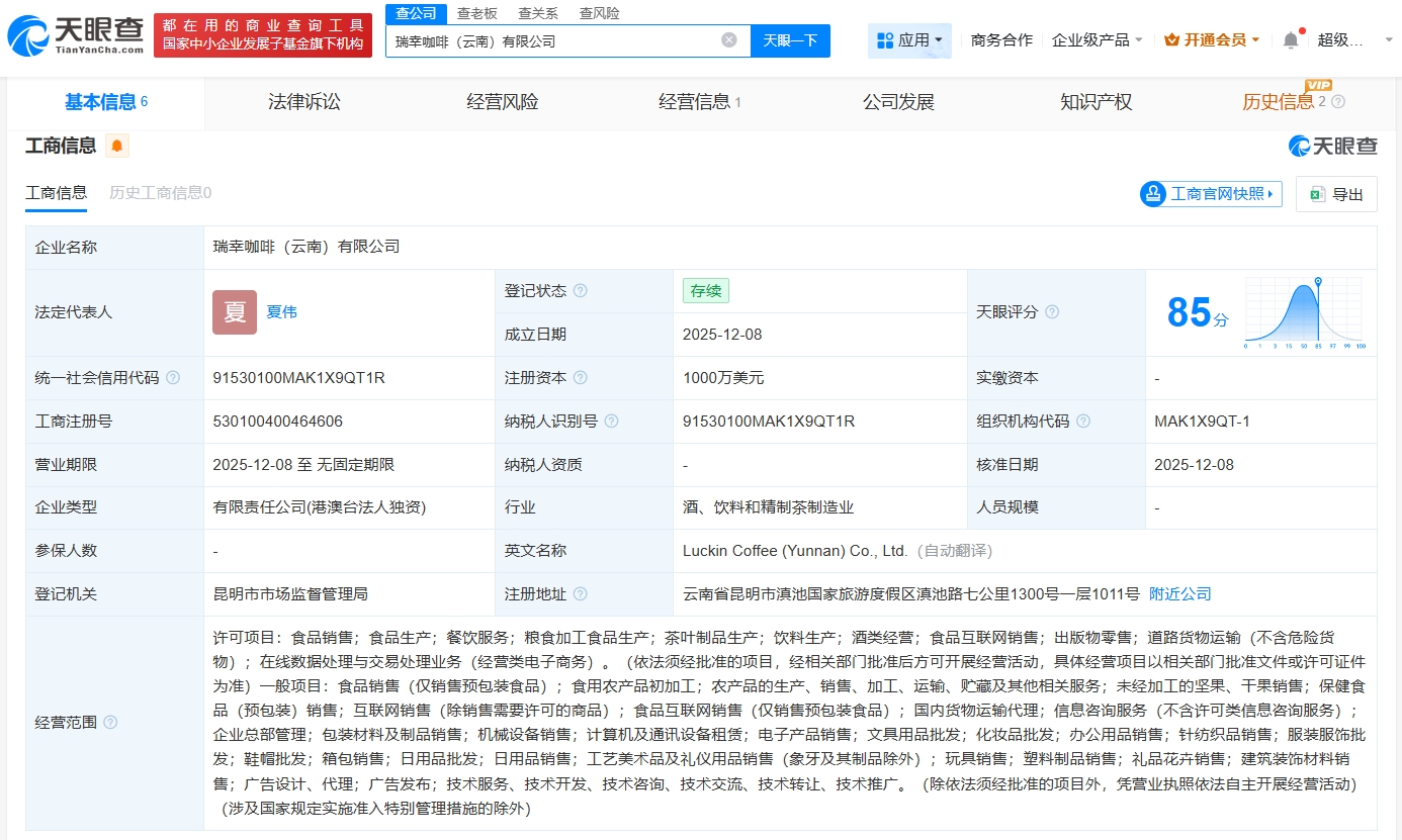 雷达财经讯,天眼查App显示,近日,瑞幸咖啡(云南)有限公司成立,法定代表人为夏伟,注册资本1000万美元,经营范围包括食品销售、食品生产、餐饮服务、茶叶制品生产等。股东信息显示,该公司由瑞幸咖啡商贸(香港)有限公司全资持股。