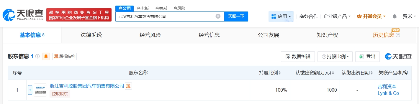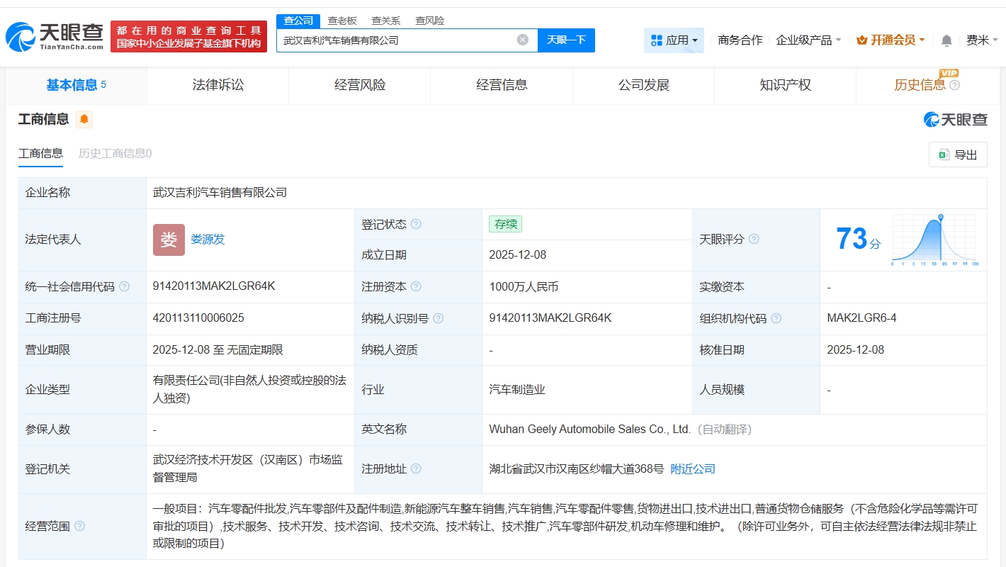 雷达财经讯,天眼查App显示,近日,武汉吉利汽车销售有限公司成立,法定代表人为娄源发,注册资本1000万人民币,经营范围包括汽车零配件批发、汽车零部件及配件制造、新能源汽车整车销售等,由浙江吉利控股集团汽车销售有限公司全资持股。