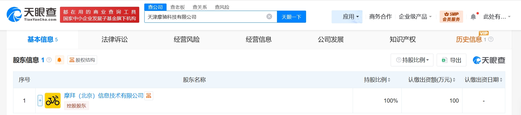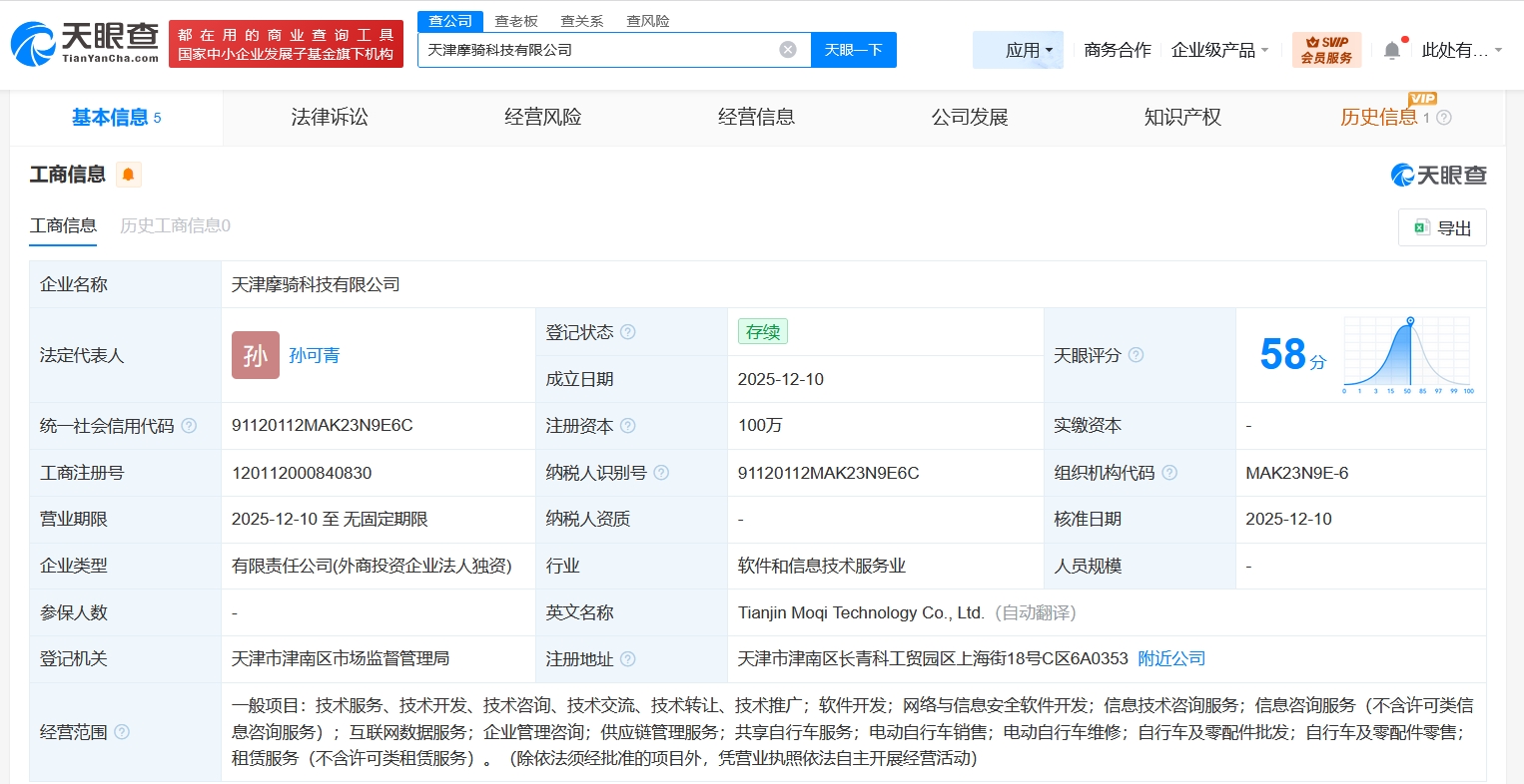 雷达财经讯,天眼查App显示,近日,天津摩骑科技有限公司成立,法定代表人为孙可青,注册资本100万人民币,经营范围含软件开发、网络与信息安全软件开发、信息技术咨询服务、信息咨询服务、互联网数据服务、企业管理咨询、供应链管理服务、共享自行车服务、租赁服务等,由摩拜(北京)信息技术有限公司全资持股。