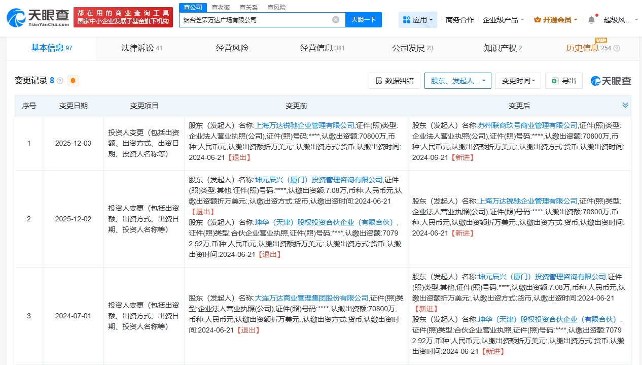 值得注意的是,近日,上海万达锐驰企业管理有限公司接手烟台芝罘万达广场有限公司,随后又将该公司股份转让至苏州联商玖号商业管理有限公司。