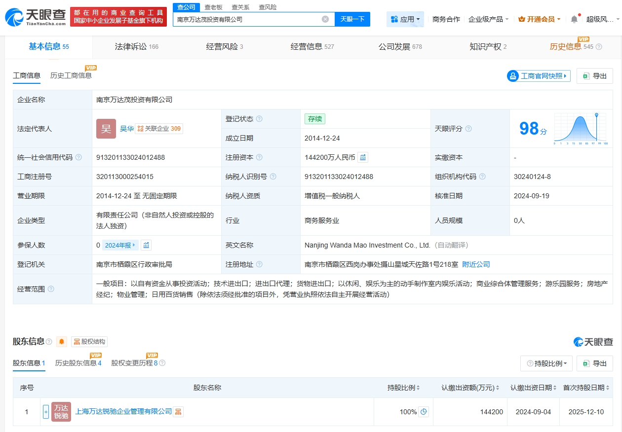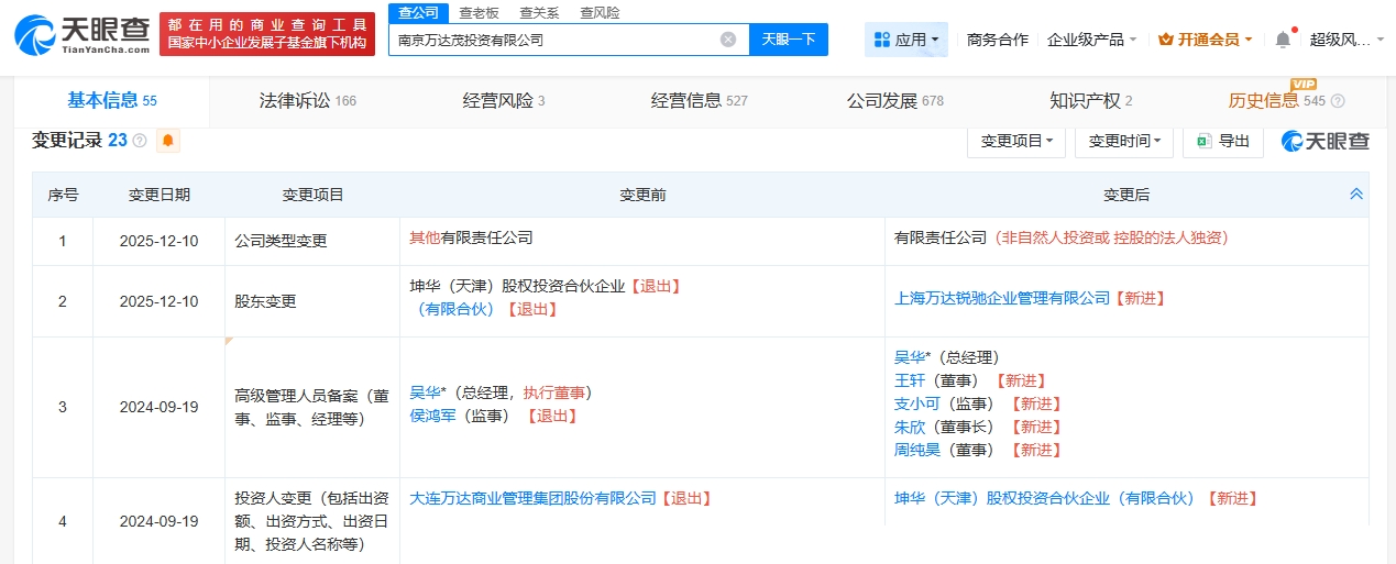 雷达财经讯,天眼查App显示,近日,南京万达茂投资有限公司发生工商变更,原股东坤华(天津)股权投资合伙企业(有限合伙)退出,新增上海万达锐驰企业管理有限公司为全资持股。变更记录显示,2024年9月,大连万达商业管理集团股份有限公司将该公司股份转让至坤华(天津)股权投资合伙企业(有限合伙)。