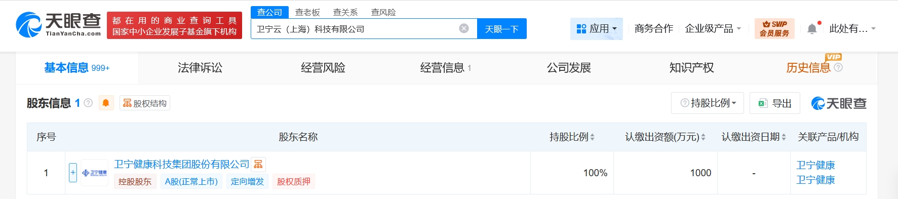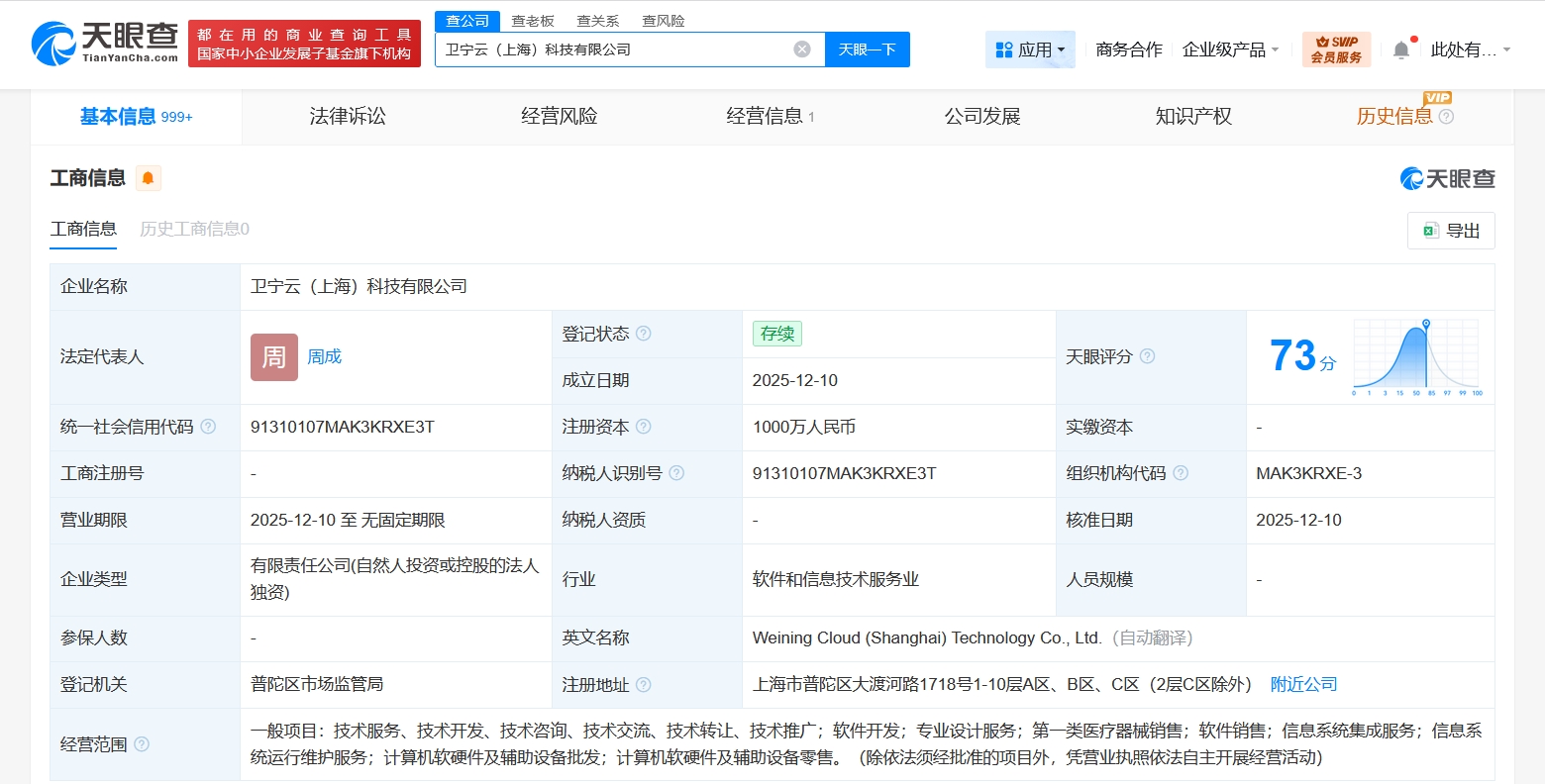 雷达财经讯,天眼查App显示,近日,卫宁云(上海)科技有限公司成立,法定代表人为周成,注册资本1000万人民币,经营范围含软件开发、专业设计服务、第一类医疗器械销售、软件销售、信息系统集成服务、信息系统运行维护服务、计算机软硬件及辅助设备批发、计算机软硬件及辅助设备零售等。股东信息显示,该公司由卫宁健康(300253)全资持股。