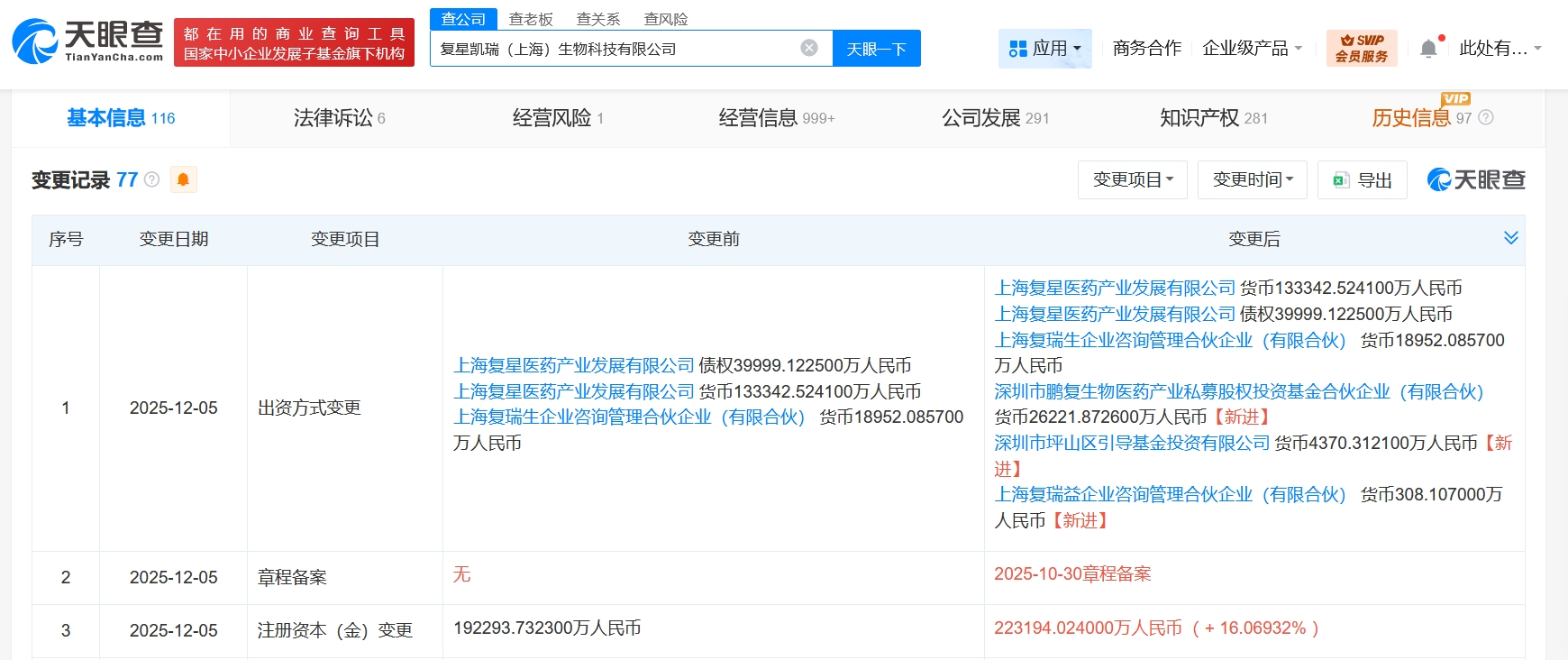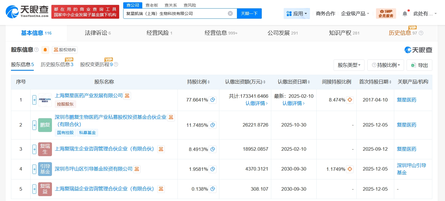 雷达财经讯,天眼查App显示,近日,复星凯瑞(上海)生物科技有限公司发生工商变更,新增深圳市鹏复生物医药产业私募股权投资基金合伙企业(有限合伙)、深圳市坪山区引导基金投资有限公司、上海复瑞益企业咨询管理合伙企业(有限合伙)为股东,同时,注册资本由约19.2亿人民币增至约22.3亿人民币,增幅约16%。