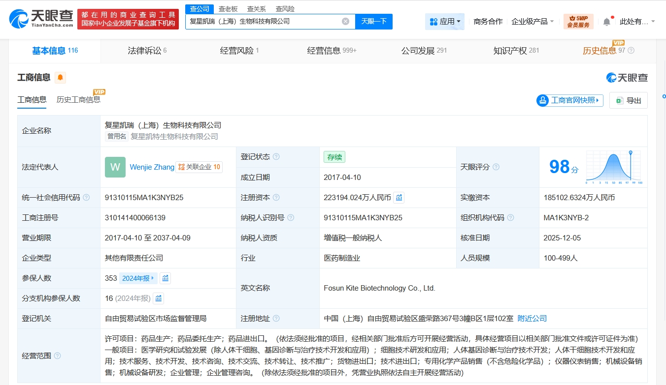 复星凯瑞(上海)生物科技有限公司成立于2017年4月,法定代表人为Wenjie Zhang,经营范围含药品生产、药品委托生产、药品进出口、医学研究和试验发展、细胞技术研发和应用、人体基因诊断与治疗技术开发、人体干细胞技术开发和应用等。股东信息显示,该公司由上海复星医药产业发展有限公司、上海复瑞生企业咨询管理合伙企业(有限合伙)及上述新增股东共同持股。